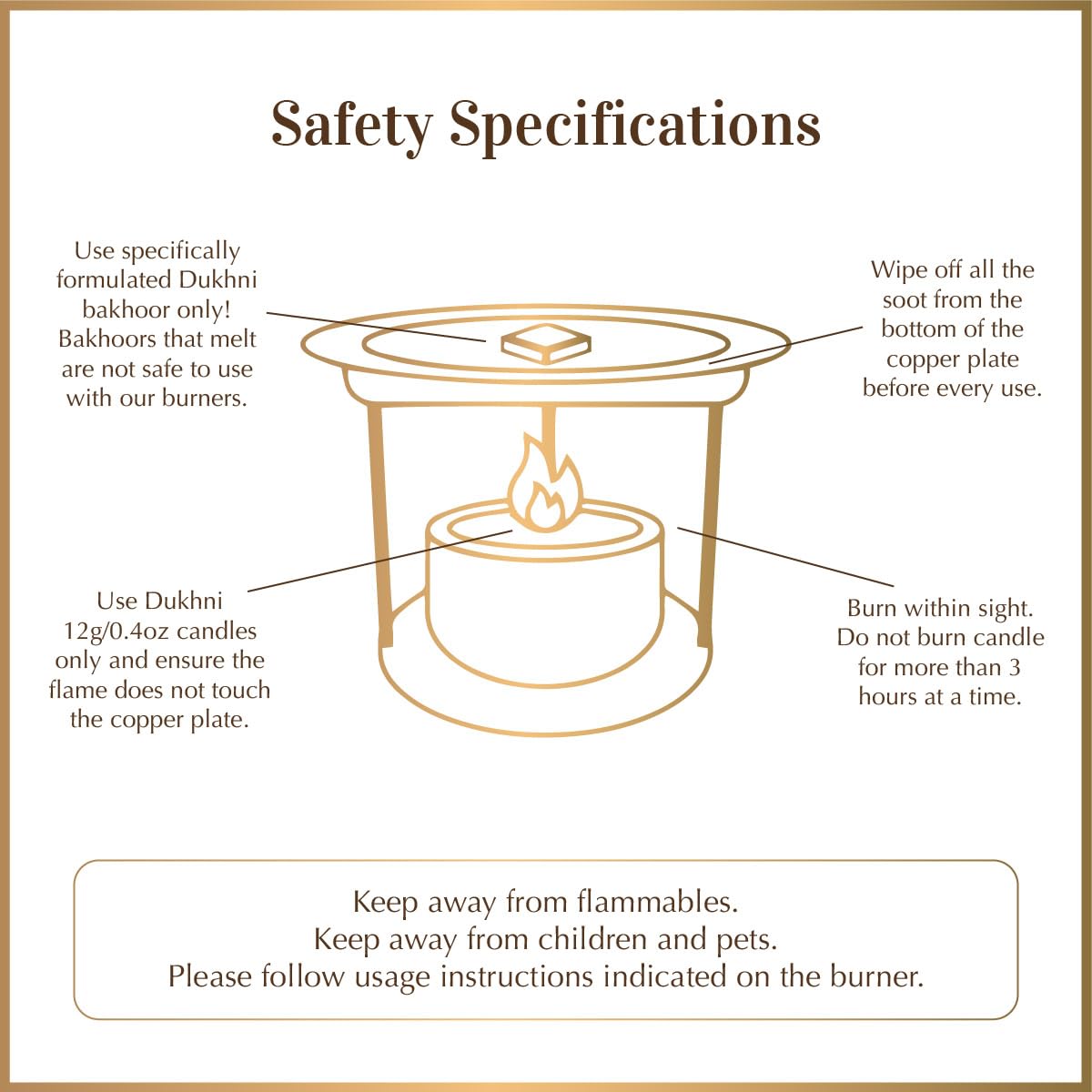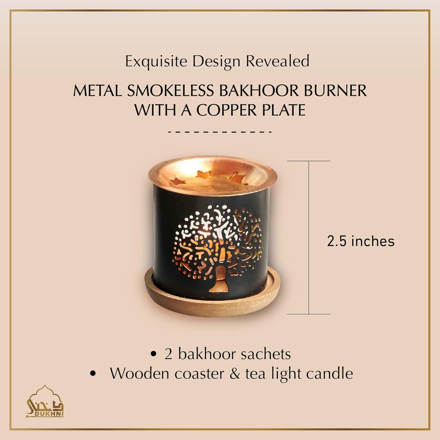 Place the wrought iron burner on the wooden coaster. Rest the copper plate on top and add one bakhoor piece. Light a tealight candle underneath the plate. For stronger aroma, add more pieces or use in a larger space. For best results, use only with Dukhni bakhoor.